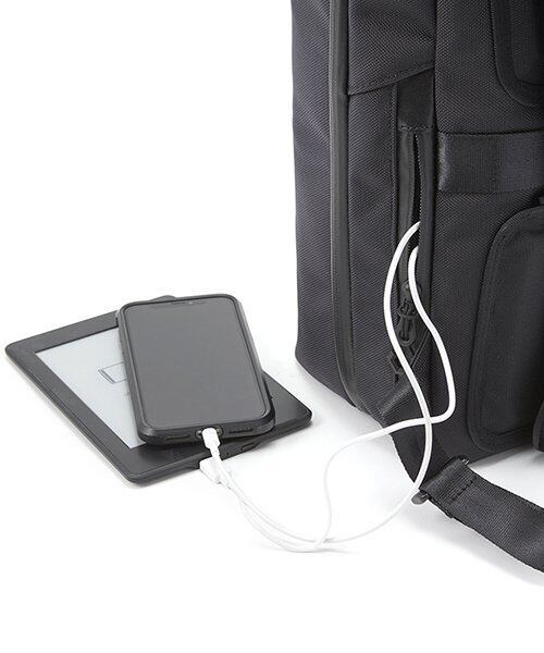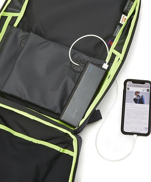 ・サイドファスナーポケットのホールを利用してバッグ内部のモバイルバッテリーとモバイルデバイスを接続可能